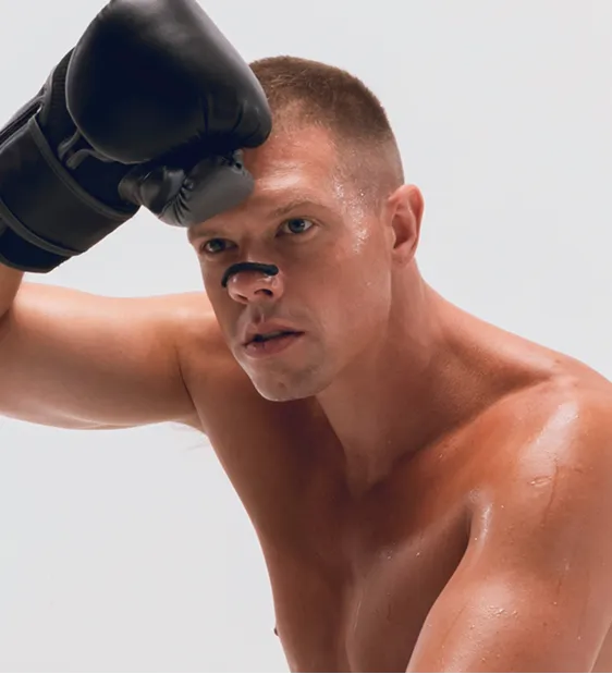 Colocá el Nose Strip sobre la nariz, apoyando los extremos magnéticos sobre los discos de acero de los adhesivos.
